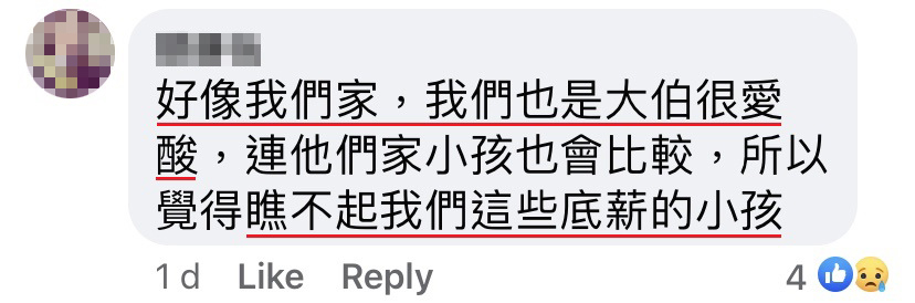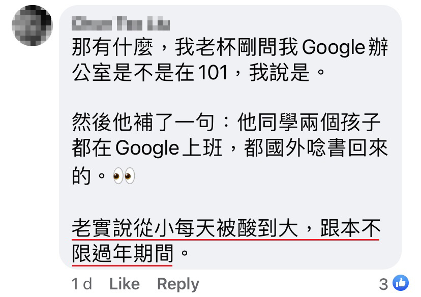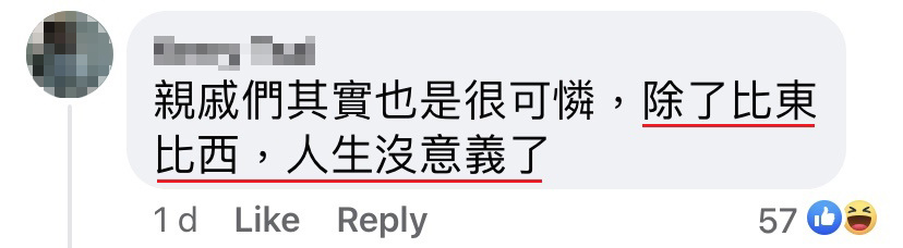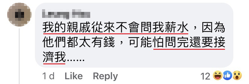 这几年回老家过年,大伯父很爱问我薪水多少,我想是因为我堂哥年薪破百万,所以拿我相比很有成就感。然后我叔叔也会附和酸几句,因为我堂弟目前读顶大,所以每次过年我都是笑柄。
