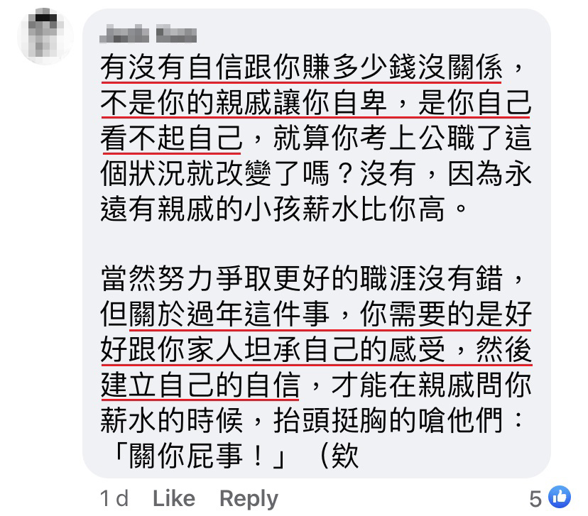 像我这样因为低薪、低就而害怕回去的人多吗?以前觉得亲戚问工作、感情这些真的很没礼貌。但现在我认为,讨厌被人家问不就是因为我觉得很丟脸吗?如果我高薪、有能力结婚,和他们同等级就不会自卑了。年轻人真的很在意面子。