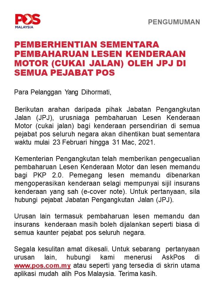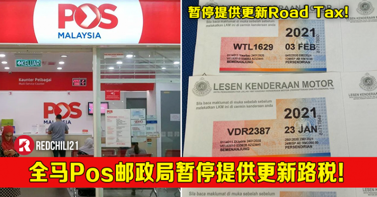根据大马邮局公司发出文告显示,接到陆路交通局(JPJ)的指示,全国Pos 邮政局将从即日起至3月31日暂时无法提供更新私人汽车路税(Road Tax)服务。