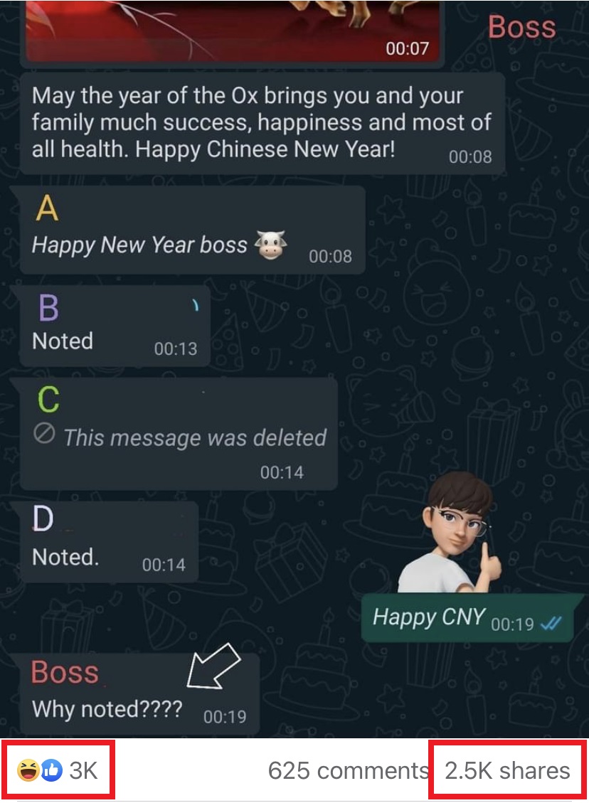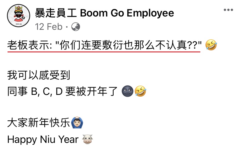 大年初一凌晨,“暴走员工”粉专发文分享了一张 WhatsApp 截图,老板写了一段祝贺语给员工们送上新年祝福,没想到得到的回复这么不走心!
