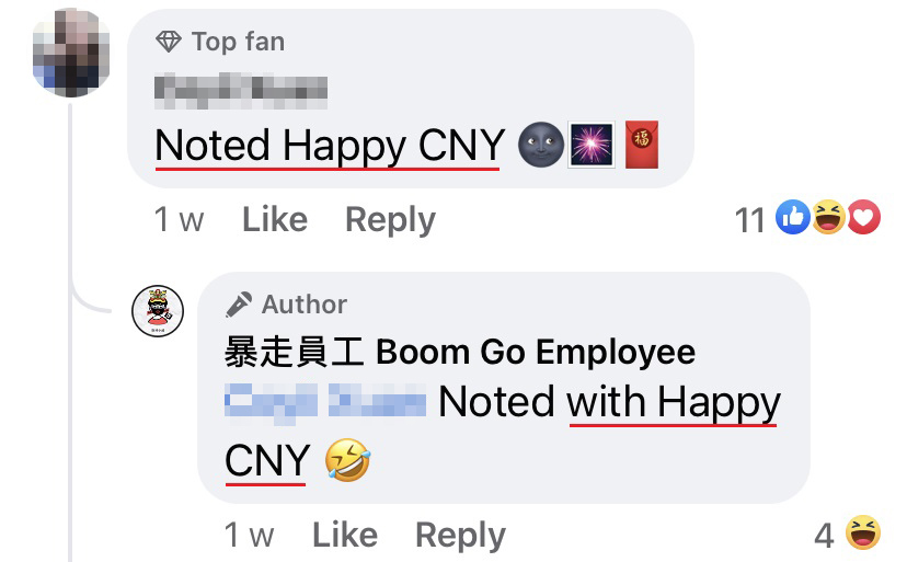 E员工则礼貌地缩写回复:「Happy CNY(新年快乐)」