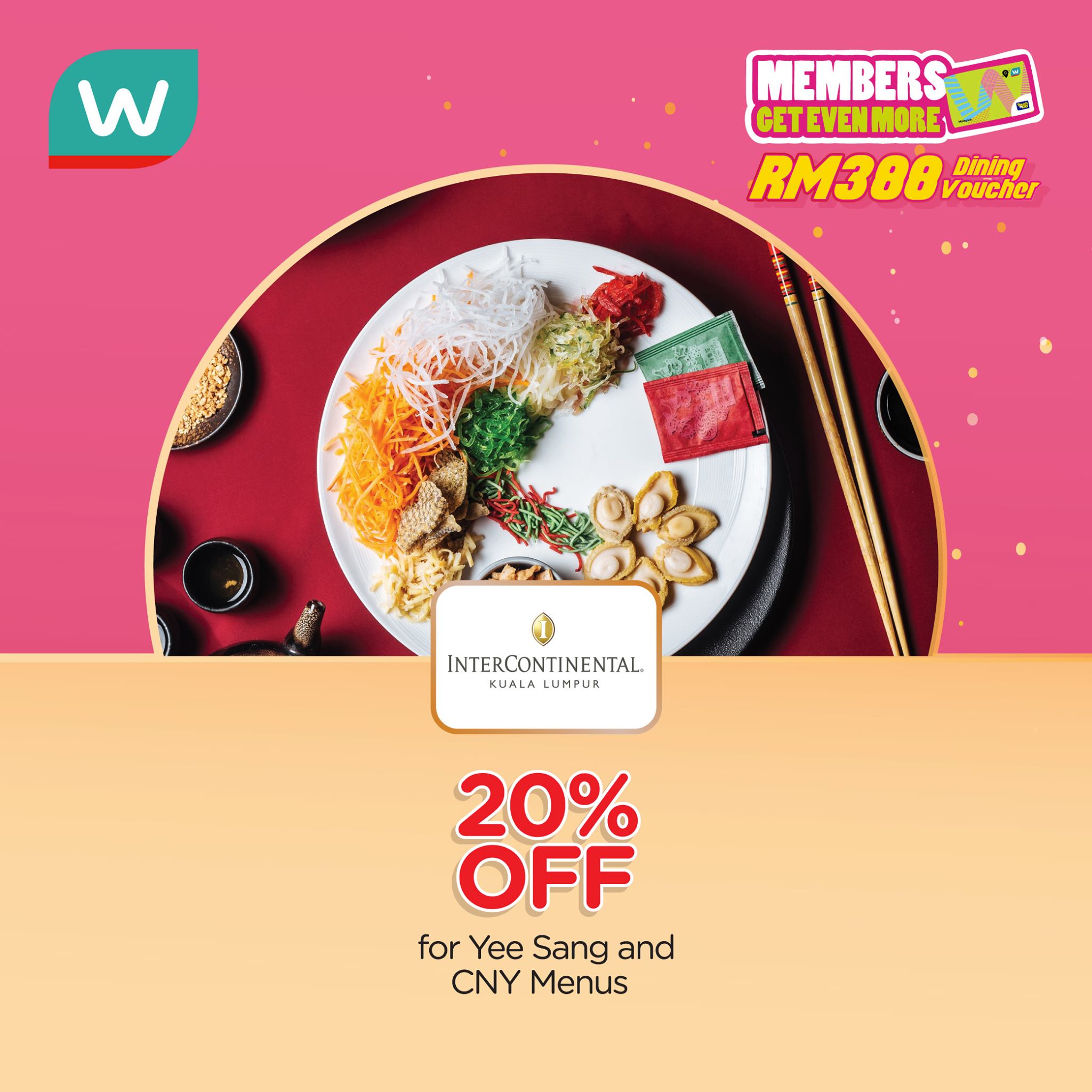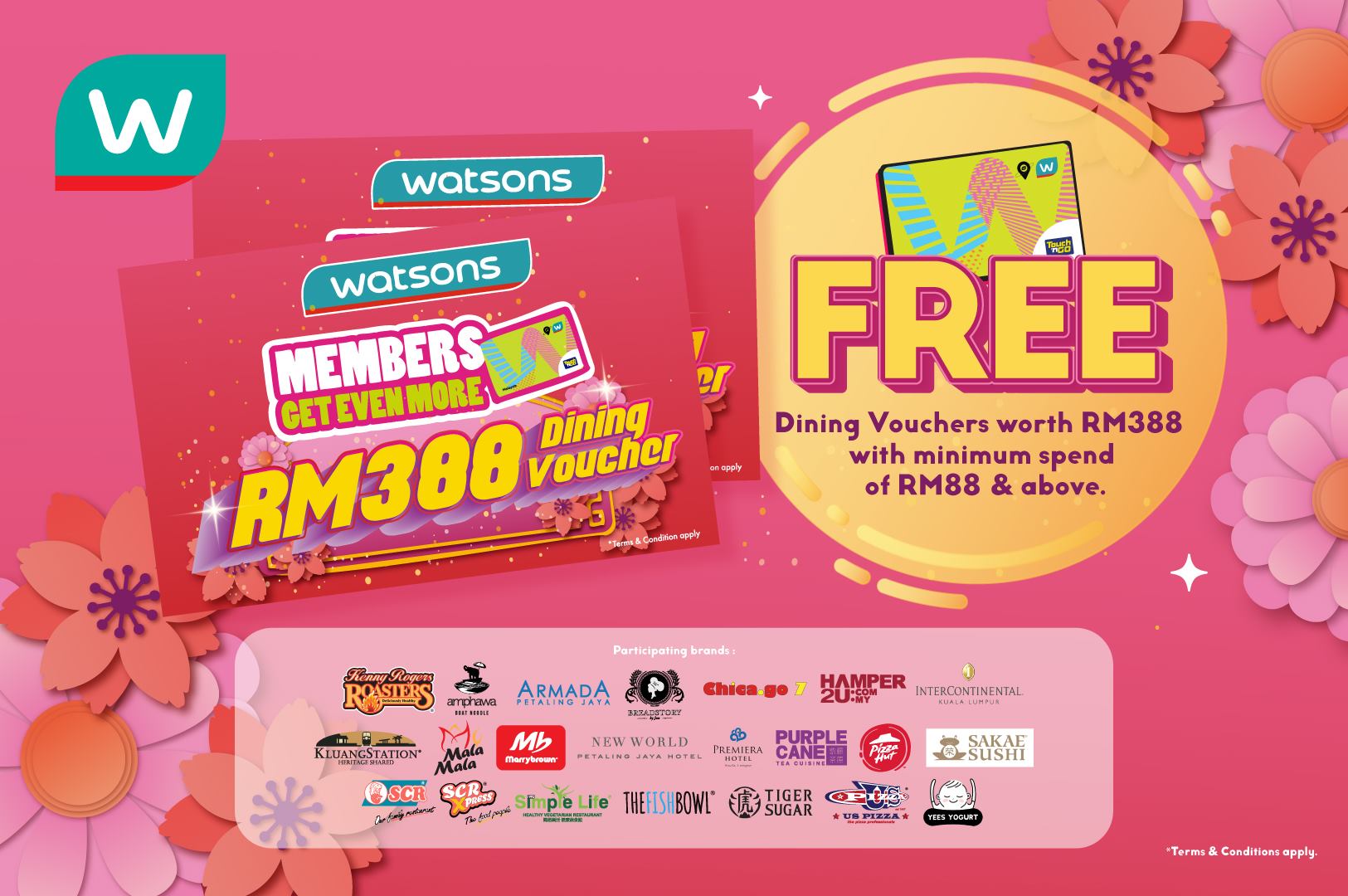- 想要获得这项活动,顾客需在Watsons 商店或官网消费RM88 或以上(单张收据)就可获得价值RM388 美食餐券!