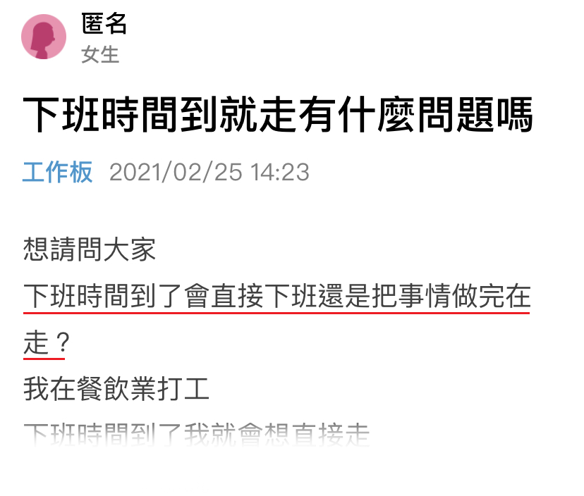 近日台湾一名工读生就在 Dcard 匿名发文,领时薪的她认为每天准时下班走人是理所当然的事,没想到却遭到身边同事的批评,说她没有责任感,令她非常疑惑!