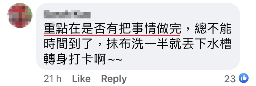 很多时候其他区域都清洁完毕,但等到那一组客人走之后,还要特別再去清洁刚刚没清洁到的地方,以至于会拖到下班时间,没办法准时走。