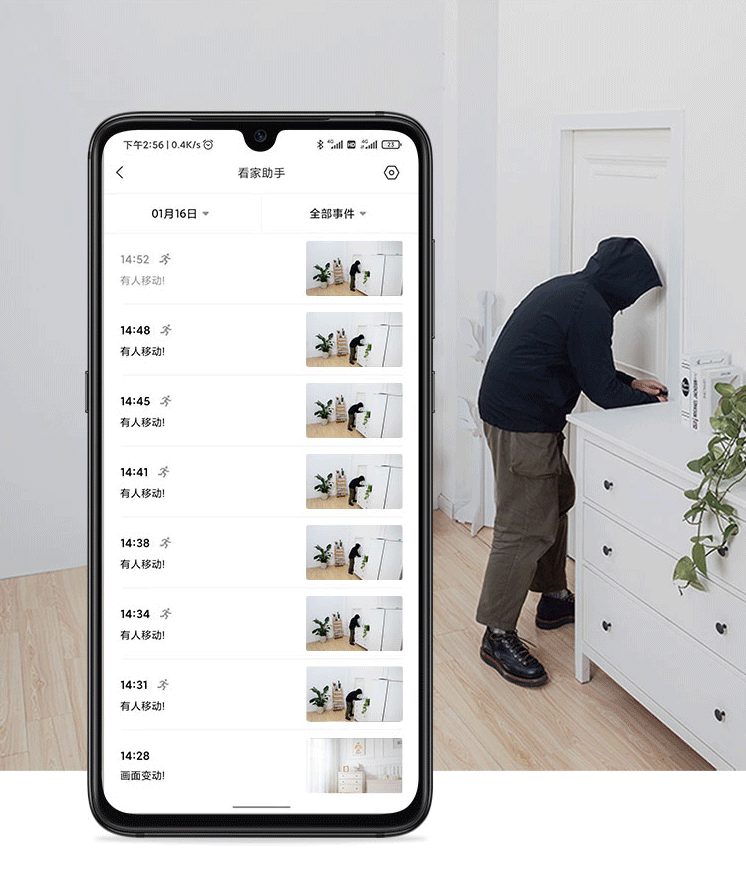 此外,还采用新一代AI 人形侦测算法,视频无需上传到云端进行识别,可快速的识别人形轮廓,并发送短视频到手机里。