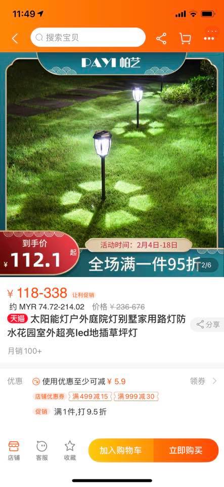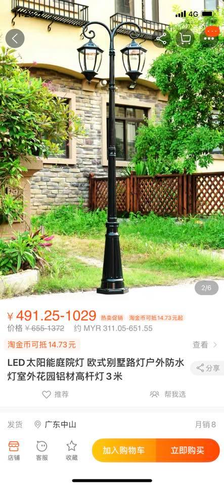 ▼ 淘宝 – 户外庭院的太阳能灯(约 RM74-RM212)