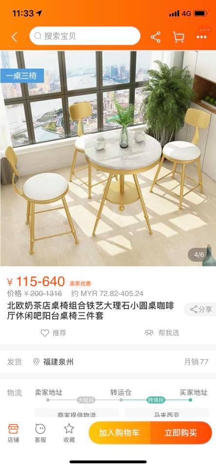 ▼ 淘宝 – 奶茶店桌椅组合(约 RM72-RM402)