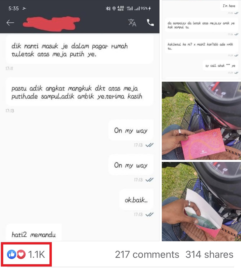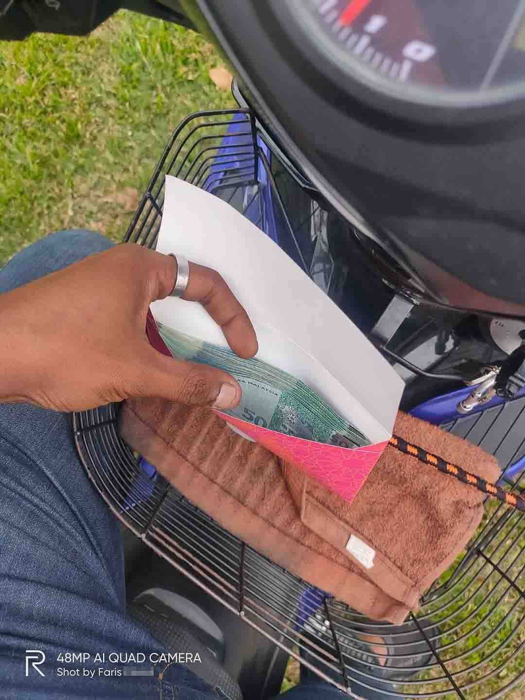 ▼ 该外卖员送完顾客的外卖以后,回到自己的摩哆然后打开信封,惊见里面的现金竟然有多达RM1,000!