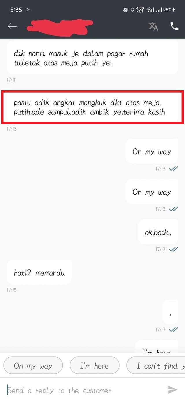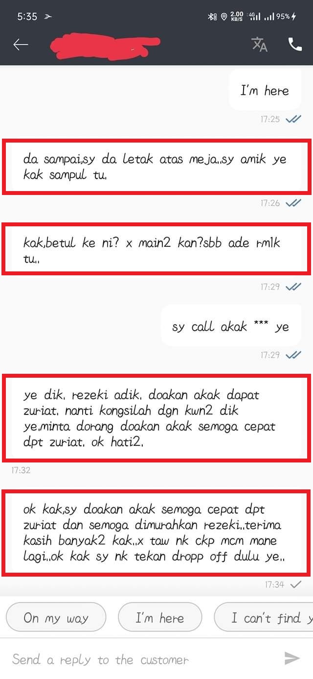 ▼ 外卖员随后立刻传讯息询问该顾客:「姐姐,这是真的吗?不是开玩笑的吧?因为这里面有RM1,000啊.. 我现在打电话给您吧!」
