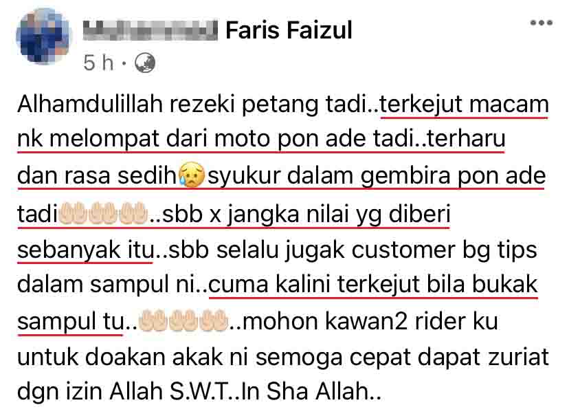 一名大马外卖员在“FoodPanda Rider Malaysia”面子书群组分享自己的亲身经历,顾客给的现金贴士竟然多达RM1,000!