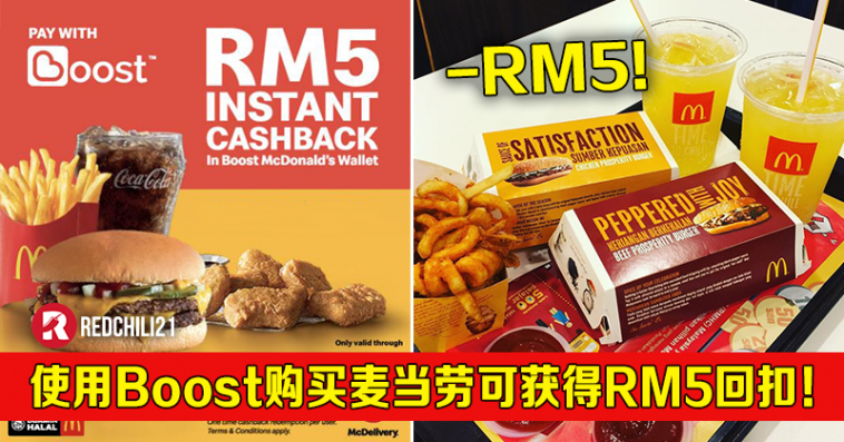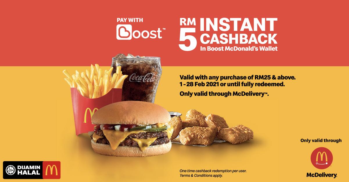 从即日起至 2月28日,只要你在McDelivery 消费RM25或以上,并使用Boost 电子钱包付款,就可直接获得RM5 现金回扣啦!