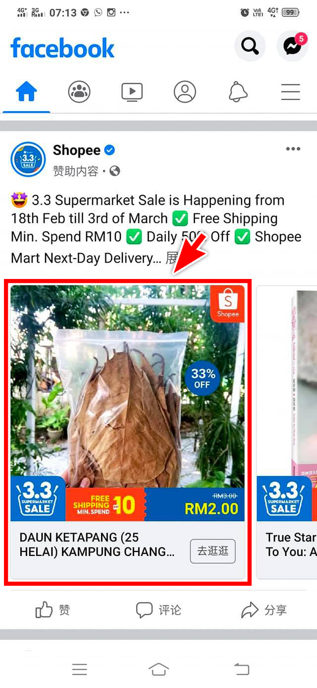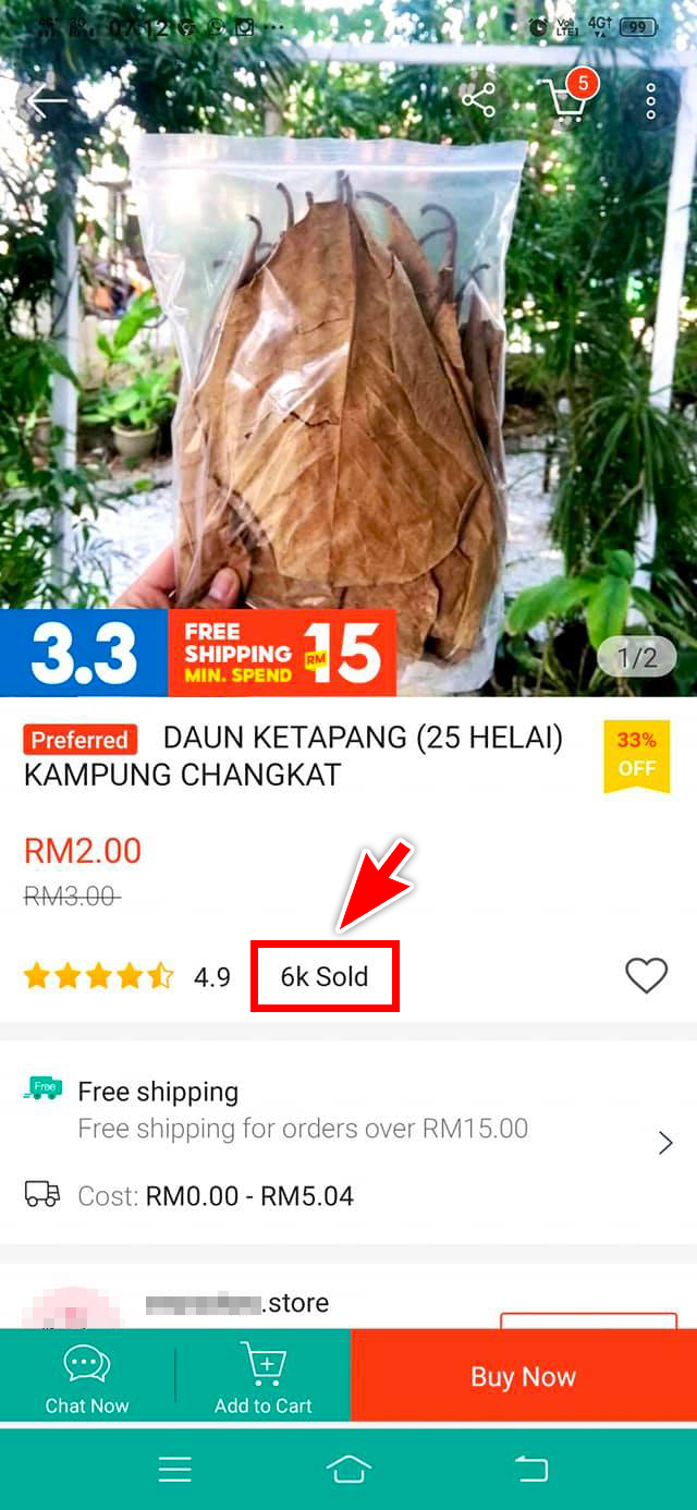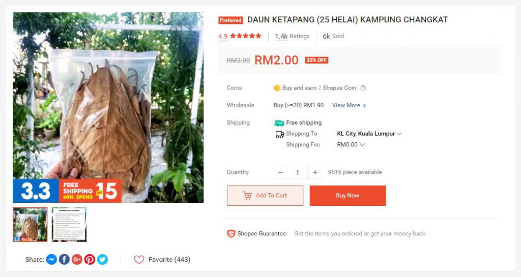 ▼ 品名写着“来自 Kampung Changkat 的榄仁叶(25片)”,一个包装为25片叶子的这款商品原价为RM3,促销价仅需RM2。而最大的亮点是它的销售量,累计多达六千单!