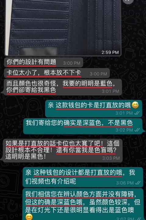▼ 奥客发了一张钱包的照片并写道:「你们的设计有问题,卡位太小了,根本放不下卡。而且颜色也很奇怪,我要的明明是蓝色,你们却寄给我黑色。」