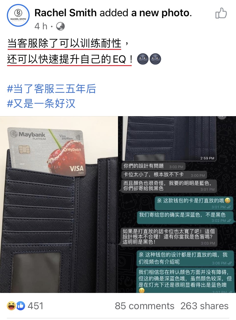 这名顾客在网购了 Rachel Smith 的钱包以后,用 WhatsApp 联系该品牌网店的客服人员,并投诉该款钱包的设计有问题,导致他的银行卡无法横着放入包里。