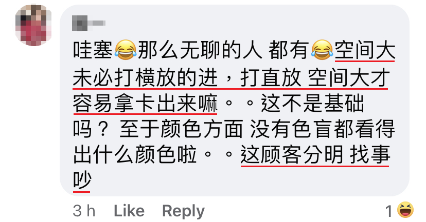 奥客:「如果打直放的话卡位也太宽了吧!这个设计根本不合理!还有你当我是色盲吗?这明明是黑色!」