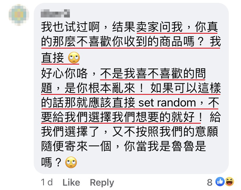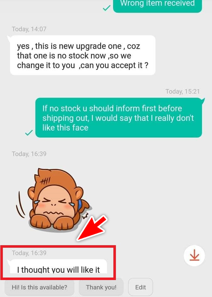 买家:「如果缺货,您应该要在发货前先让我知道。我只想说,我真的很不喜欢这个表情。」