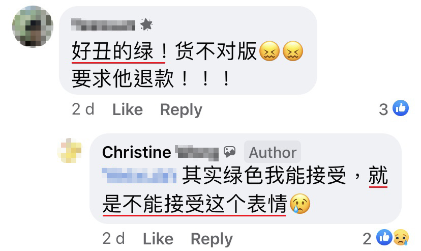 ▼ 结果收到包裹的时候只见1个浅粉色公仔和1个浅绿色的公仔,最令买家无法接受的是:绿色公仔的表情!买家写道:「颜色不一样也就算了,但表情还不一样!」