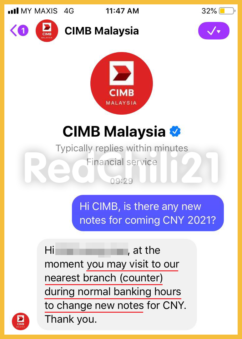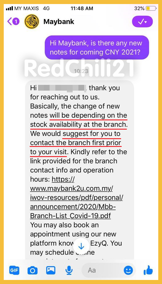 同样的小编也询问了Maybank 客服,Maybank 回复表示每间分行更换新钞是视存货而定!所以建议大家可先联系你临近的分行查询!
