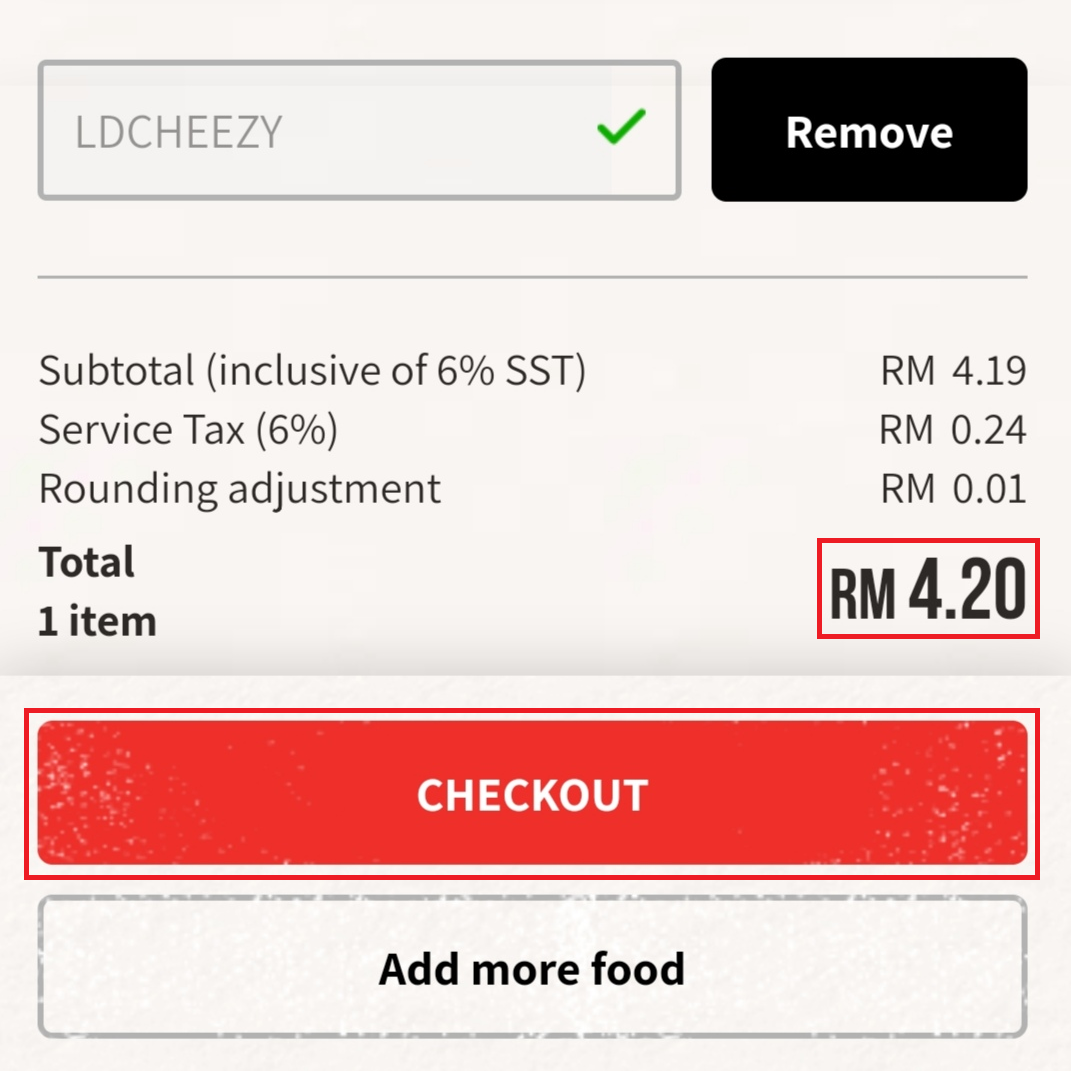 ※ 系统显示出一份Cheezy Wedges(L)只需RM4.19,包含服务税后你只需缴付RM4.20!
