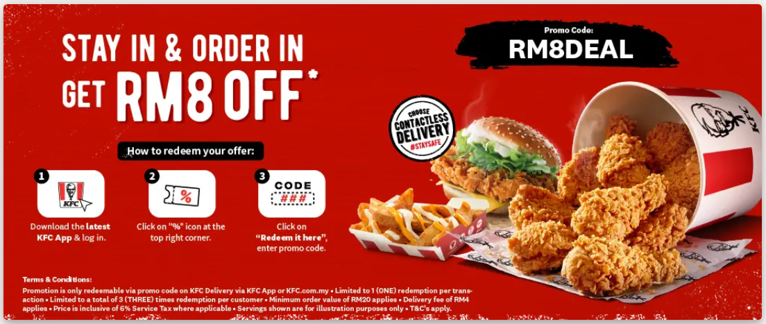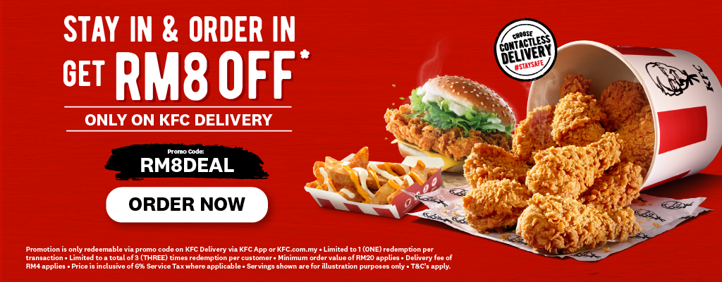 促销活动:KFC —— 推出【Stay In & Order In Get RM8 Off】美食优惠