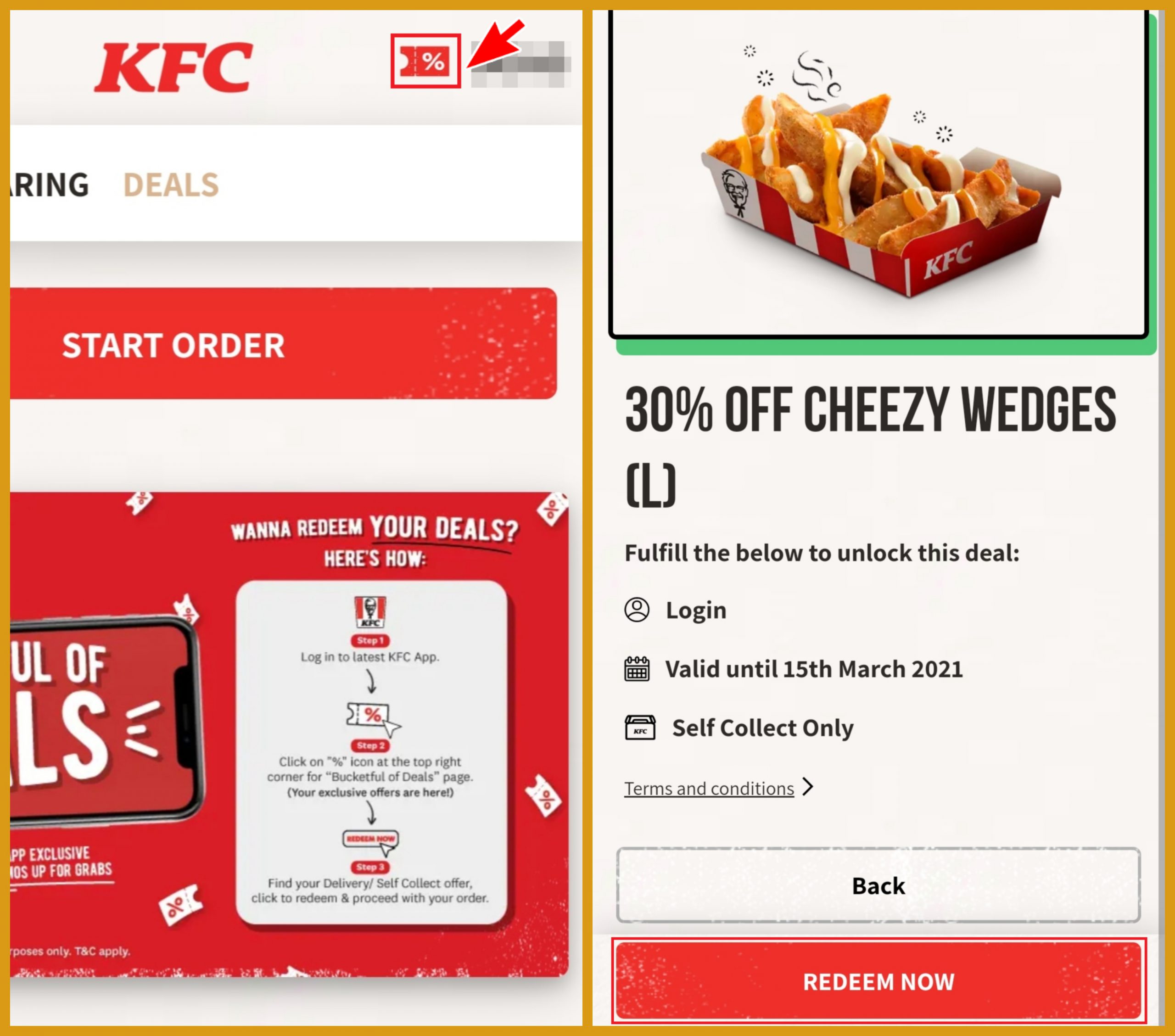 步骤4:选择其中一张美食券后 ,例如:Cheezy Wedges(L)。然后,选择「Redeem Now」。