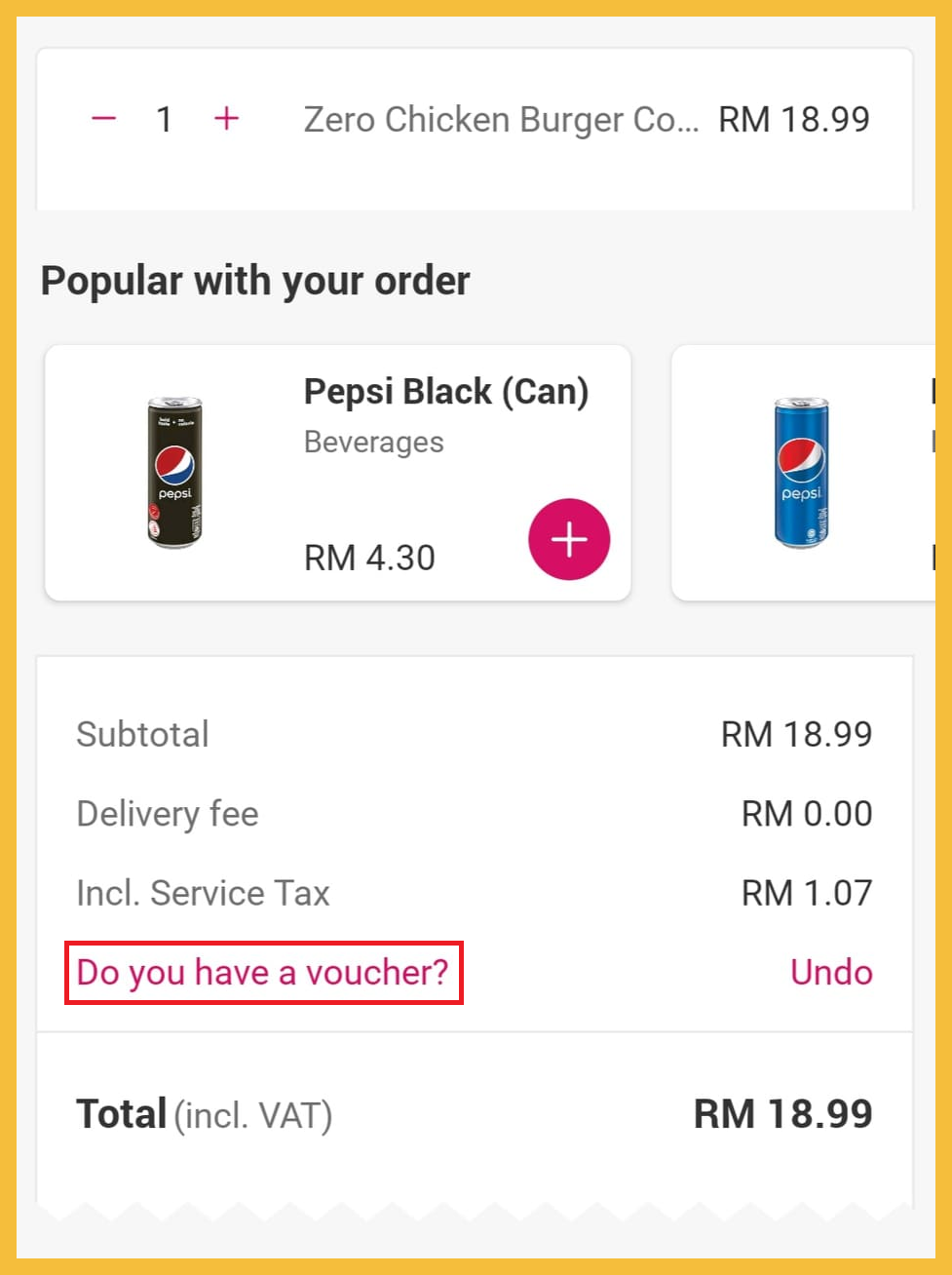 ※ 1份Zero Chicken Burger Combo 原价RM18.99,折扣36%【TASTEOFJOY】(折扣高达RM7)之后,只需RM12.15!
