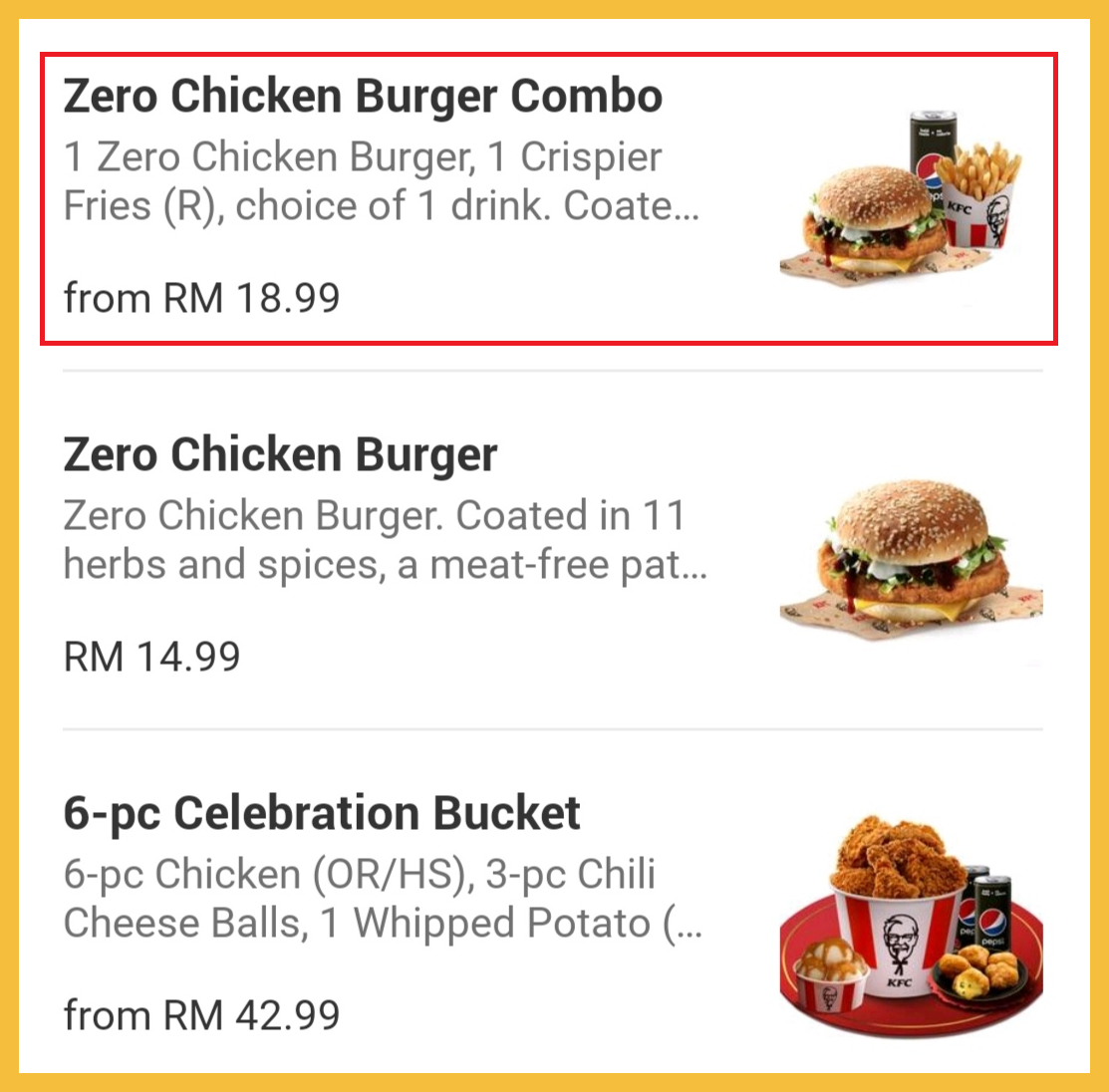 步骤2:选择你想吃餐点。例如:Zero Chicken Burger Combo。