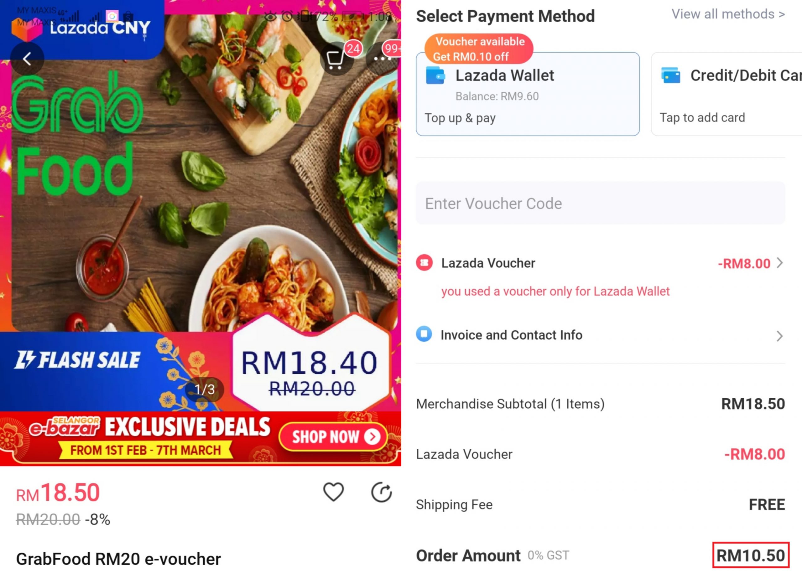 1. GrabFood RM20 e-voucher — 只需RM10.50!