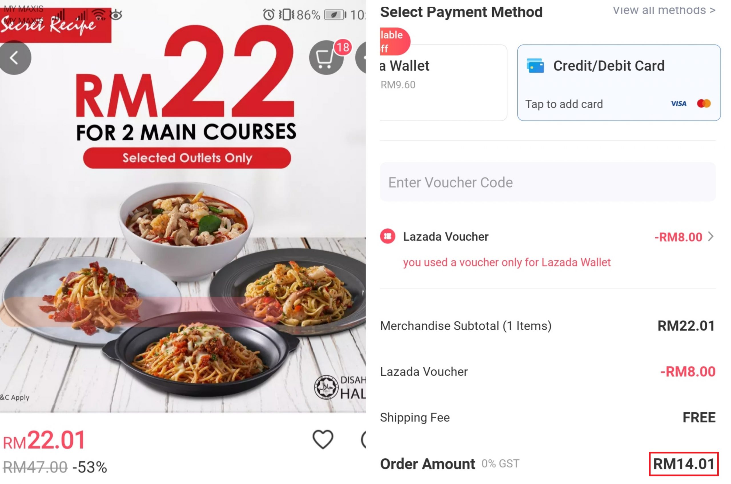 2.Secret Recipe 2份主食原价RM22 — 只需RM14.01(相当于一份主食只需RM7)