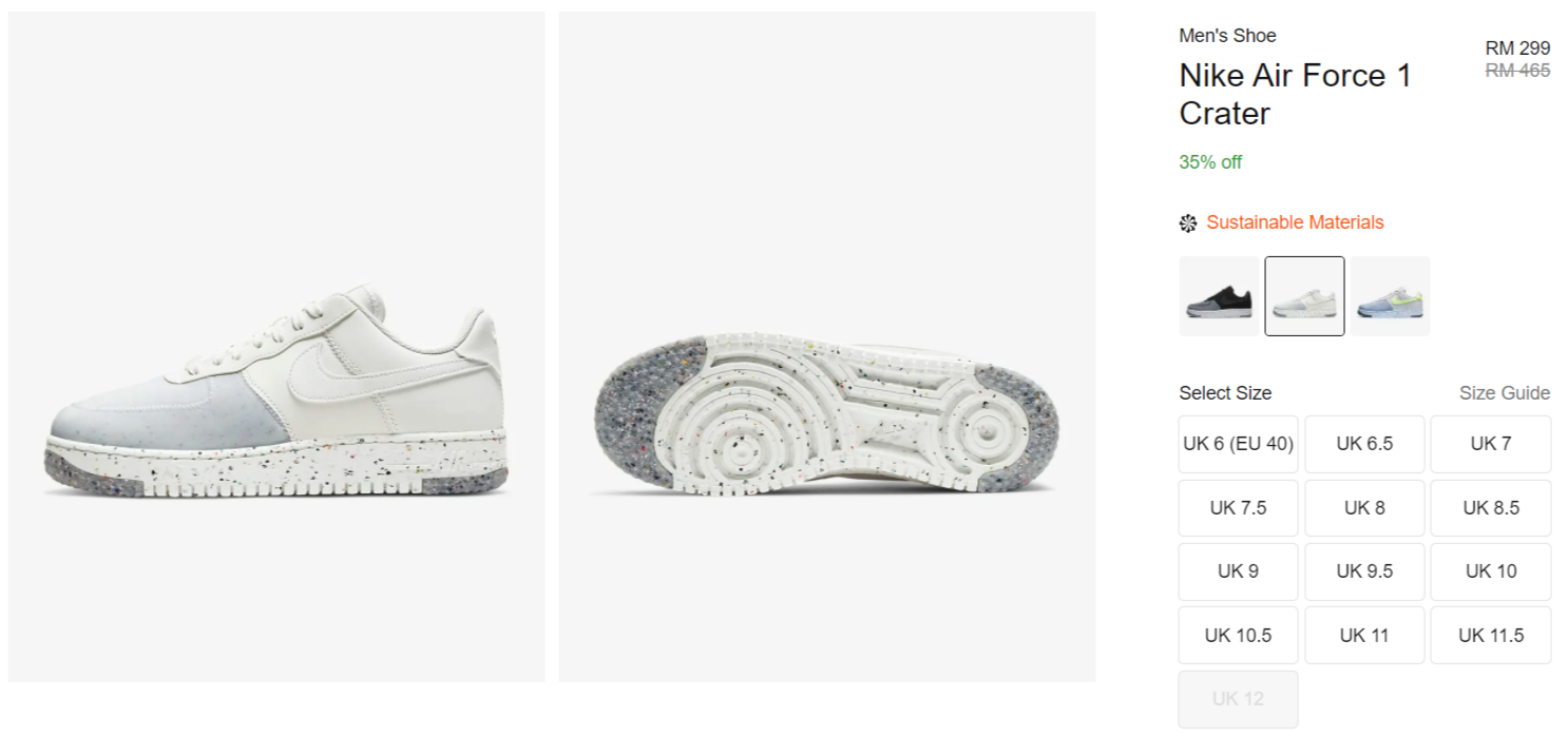 ▼ Men’s Shoe Nike Air Force 1 Crater(折扣35%)—— 只需RM299(原价RM465)