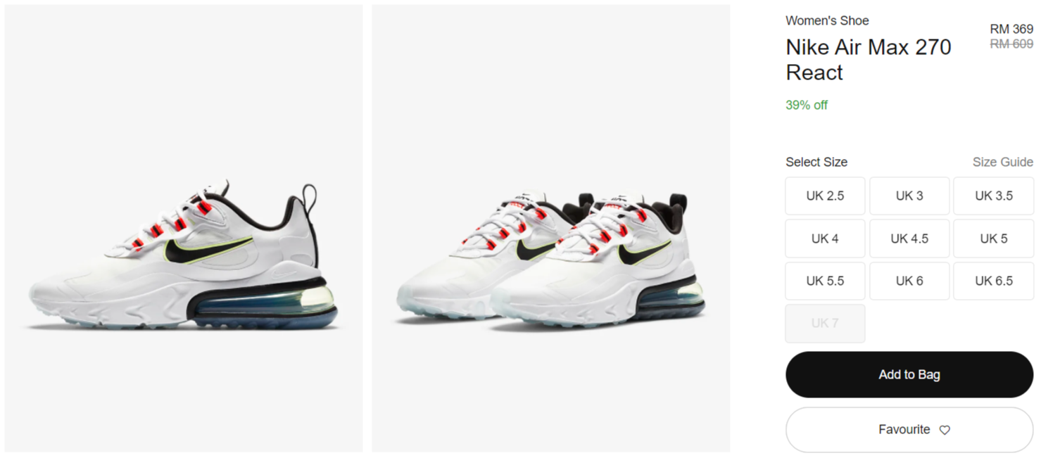 ▼ Women’s ShoeNike Air Max 270 React(折扣39%)—— 只需RM369(原价RM609)