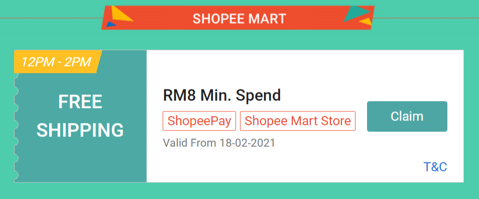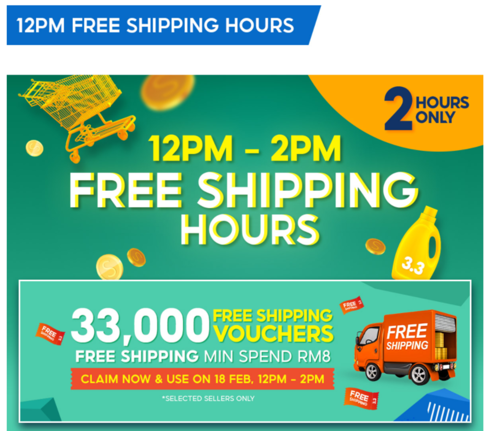 12pm 至2pm 这两时段可享有免邮费!最低消费RM8,就可获得免邮!限于Shopee Mart 及指定商家!
