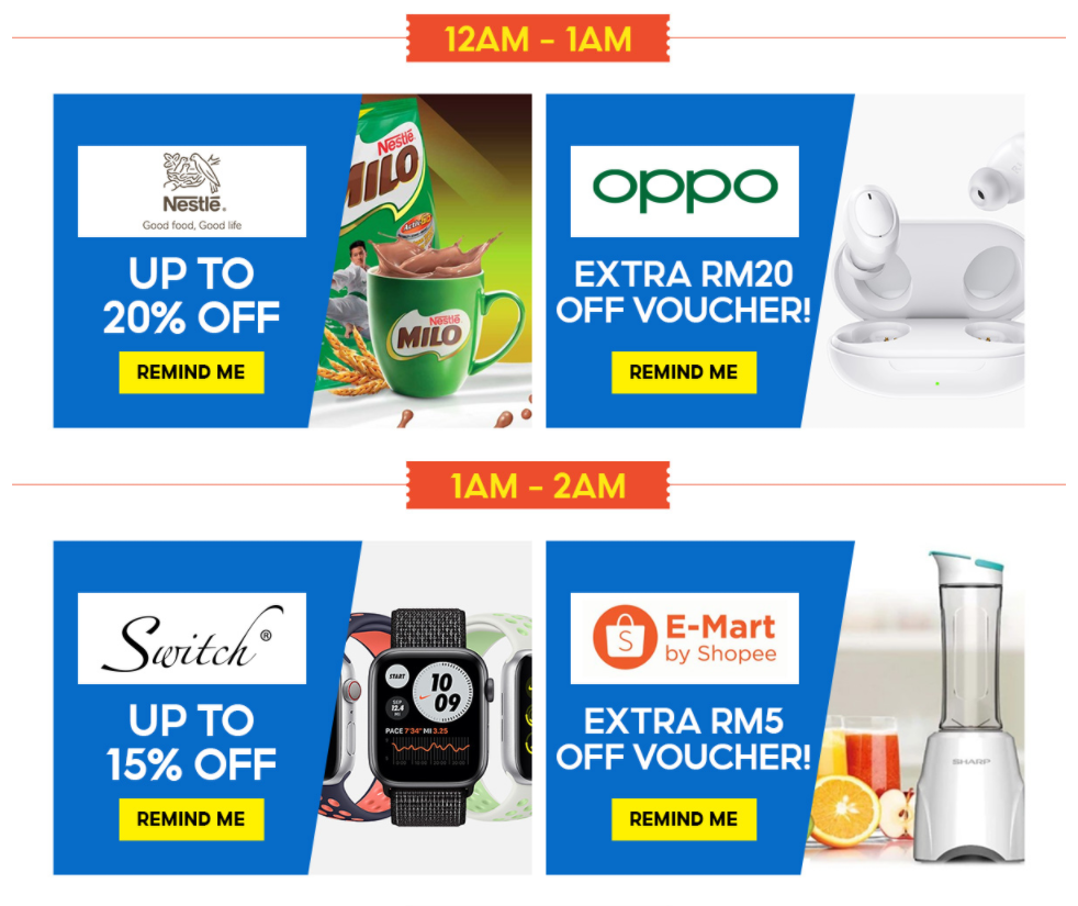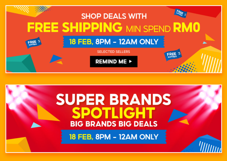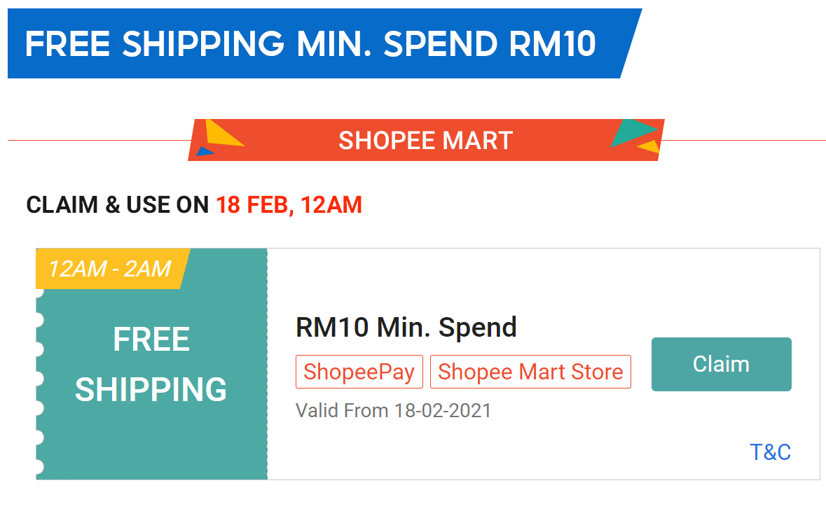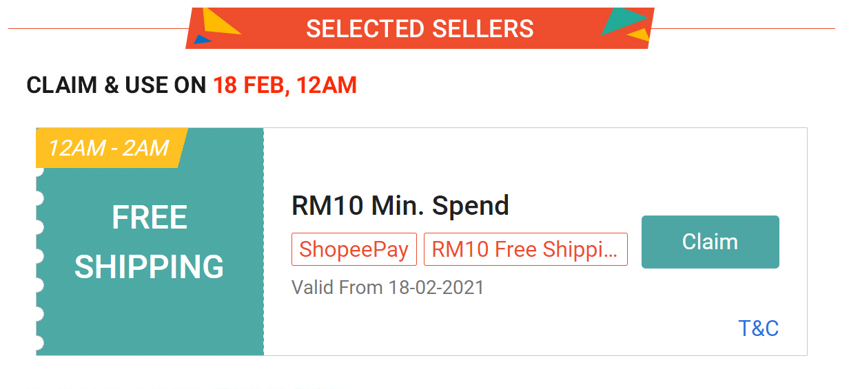 2月18日当天的12am 和8pm,Shopee 会在这时段推出免邮优惠券!