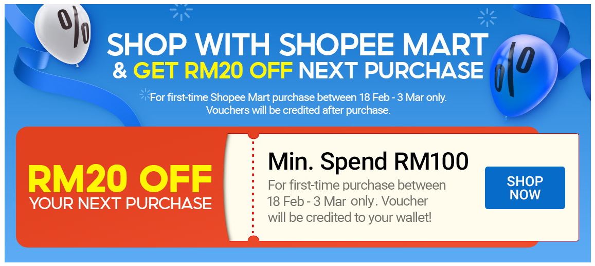 ▼第一次在Shopee Mart 消费,可获得RM20 折扣(限于下一次消费才可获得折扣)