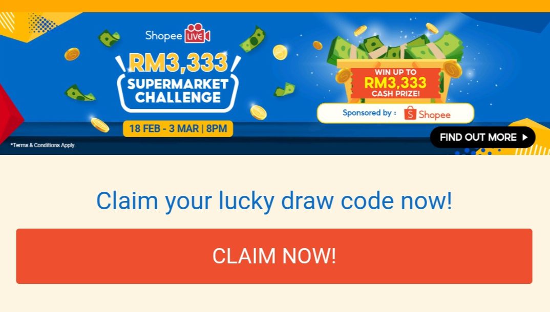 Shopee 在2月18日至3月3日期间举办【RM3333 Supermarket Challenge】直播!可机会赢取高达RM3333 奖金!
