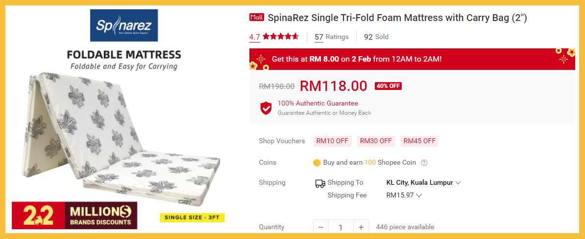 ▪ SpinaRez Single Tri-Fold Foam Mattress with Carry Bag (2″) – RM198  RM8