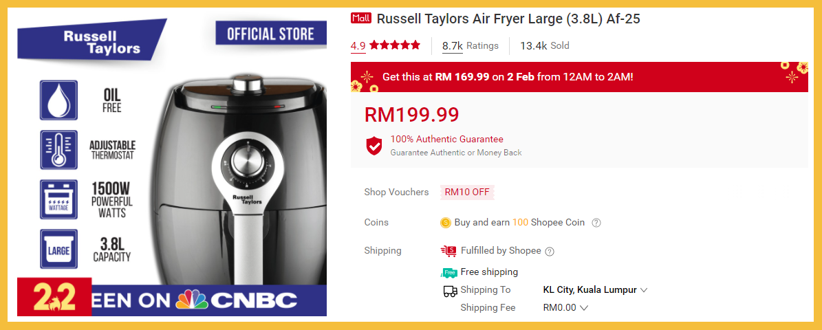 ▪ Russell Taylors Air Fryer Large (3.8L) Af-25 – RM199.99  RM169.99
