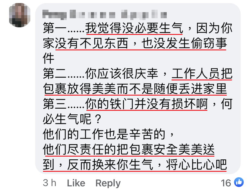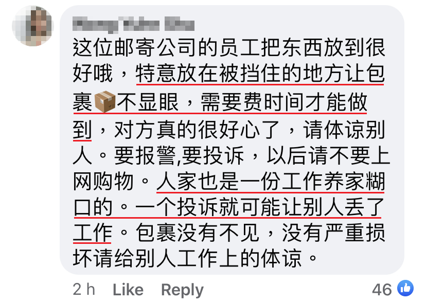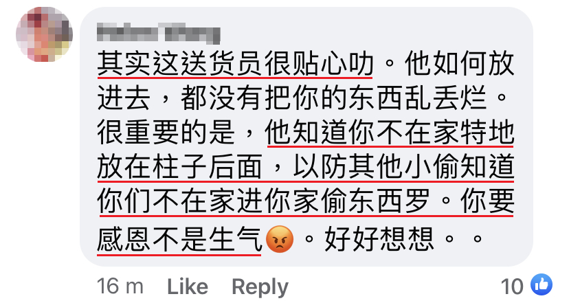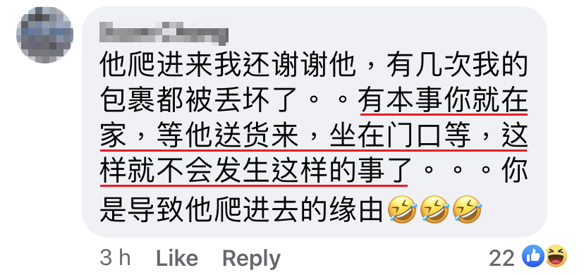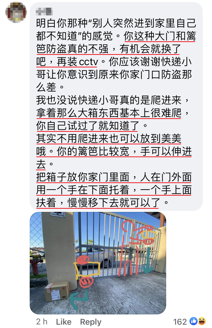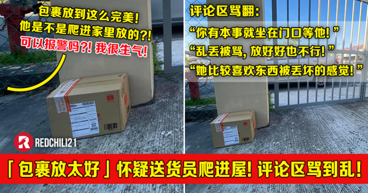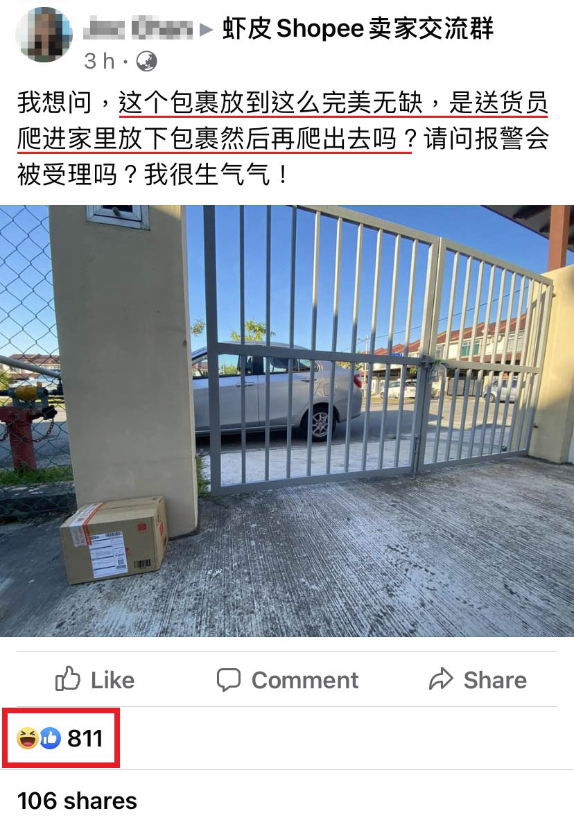 今天一名大马买家在Shopee卖家群组PO文投诉,指送货员把一箱包裹放入屋内,过于完美的位置令她怀疑送货员是像贼一样爬了进来,气得她想要报警处理。