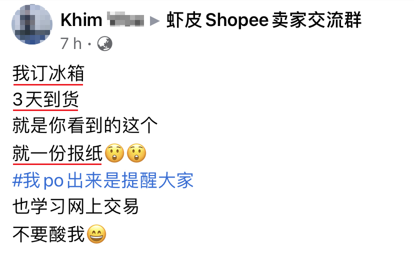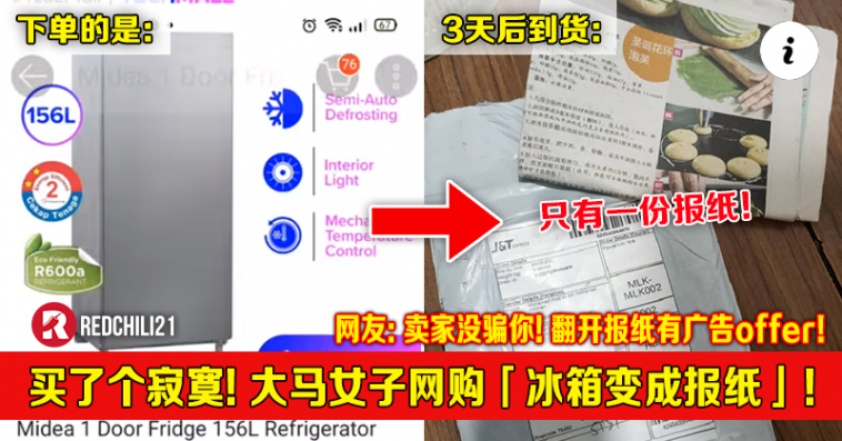今天一名大马女子在“Shopee 卖家交流群”PO文,网购一台冰箱,3天后到货竟然是一份报纸!