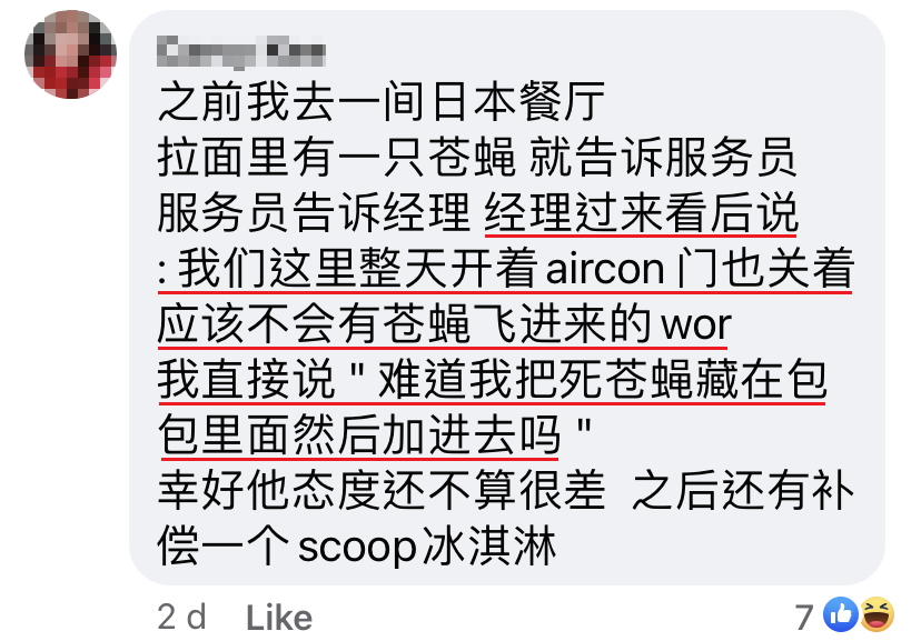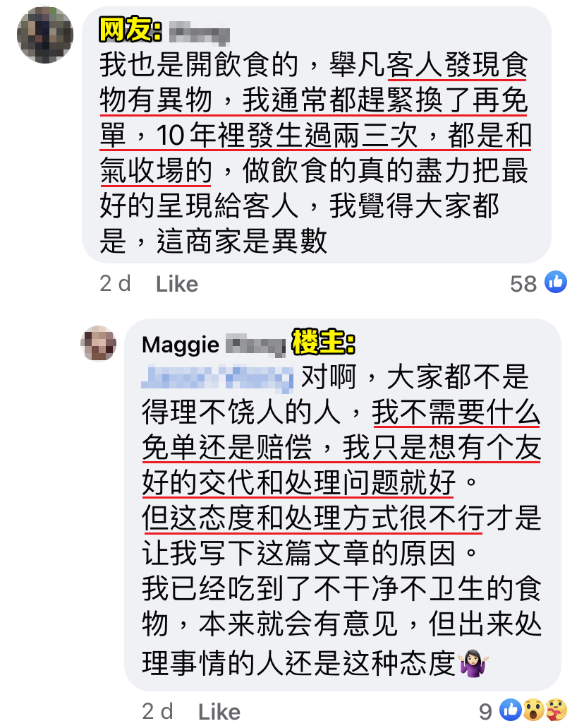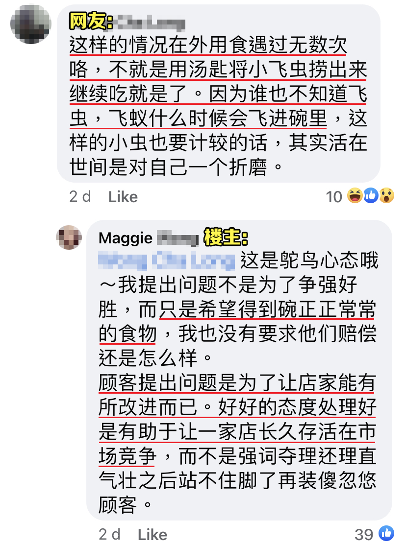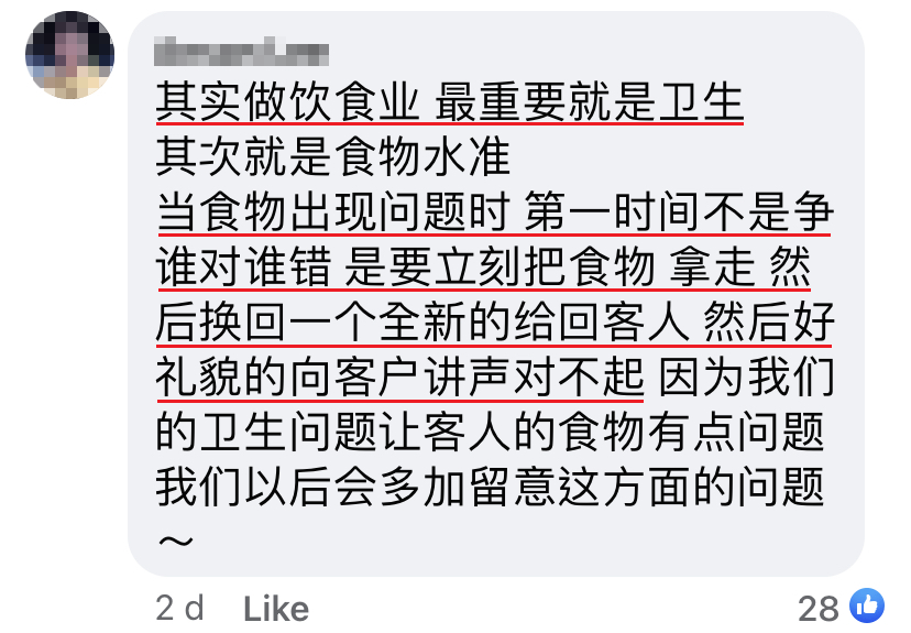 认识我的人都知道,只要态度好,其它的事真的可以互相谅解。但不可能我出钱来吃东西,食物出现【虫】就算了,还得受店家的气?这不应该吧?我们出来消费没欠你任何东西吧?