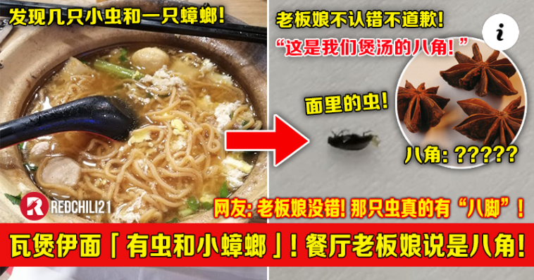 一名大马女网友近日和家人到一家餐厅用餐,结果发现热腾腾的瓦煲伊面里居然有好几只小虫,而老板娘给的解释竟然是:「那是我们煲汤的八角皮来的!」