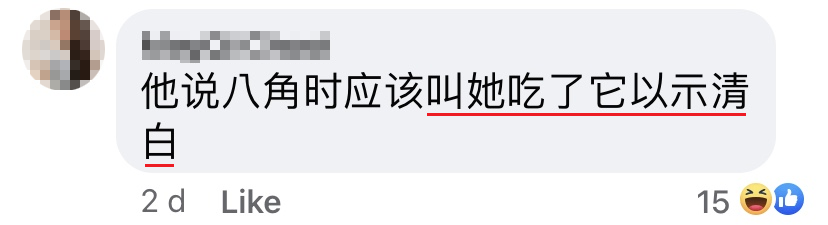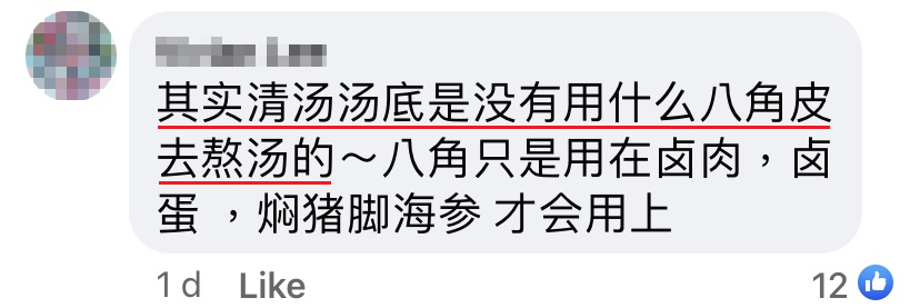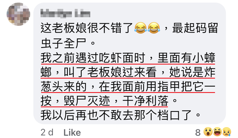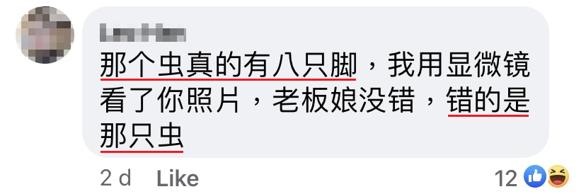 我就叫了服务员跟她说里面有虫,她就把面拿给回去给她“老板娘”看,后来“老板娘”很大声过来跟我说:「那个不是虫,是我们煲汤的八角皮来的。你要怎样?那面我拿回来给你。」