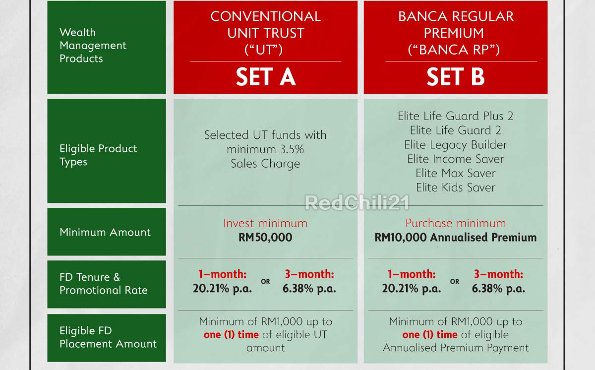 详情:需要对选定的单位信托基金(Unit Trust;简称UT funds)进行投资或购买Banca Regular Premium (RP)产品才有资格参与定期存款促销