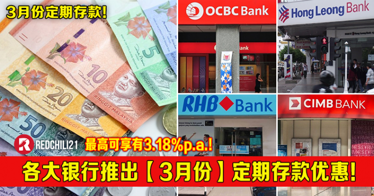 在这3月份,大马各大银行推出定期存款(Fixed Deposit)促销优惠,最高可享有3.18%p.a.!