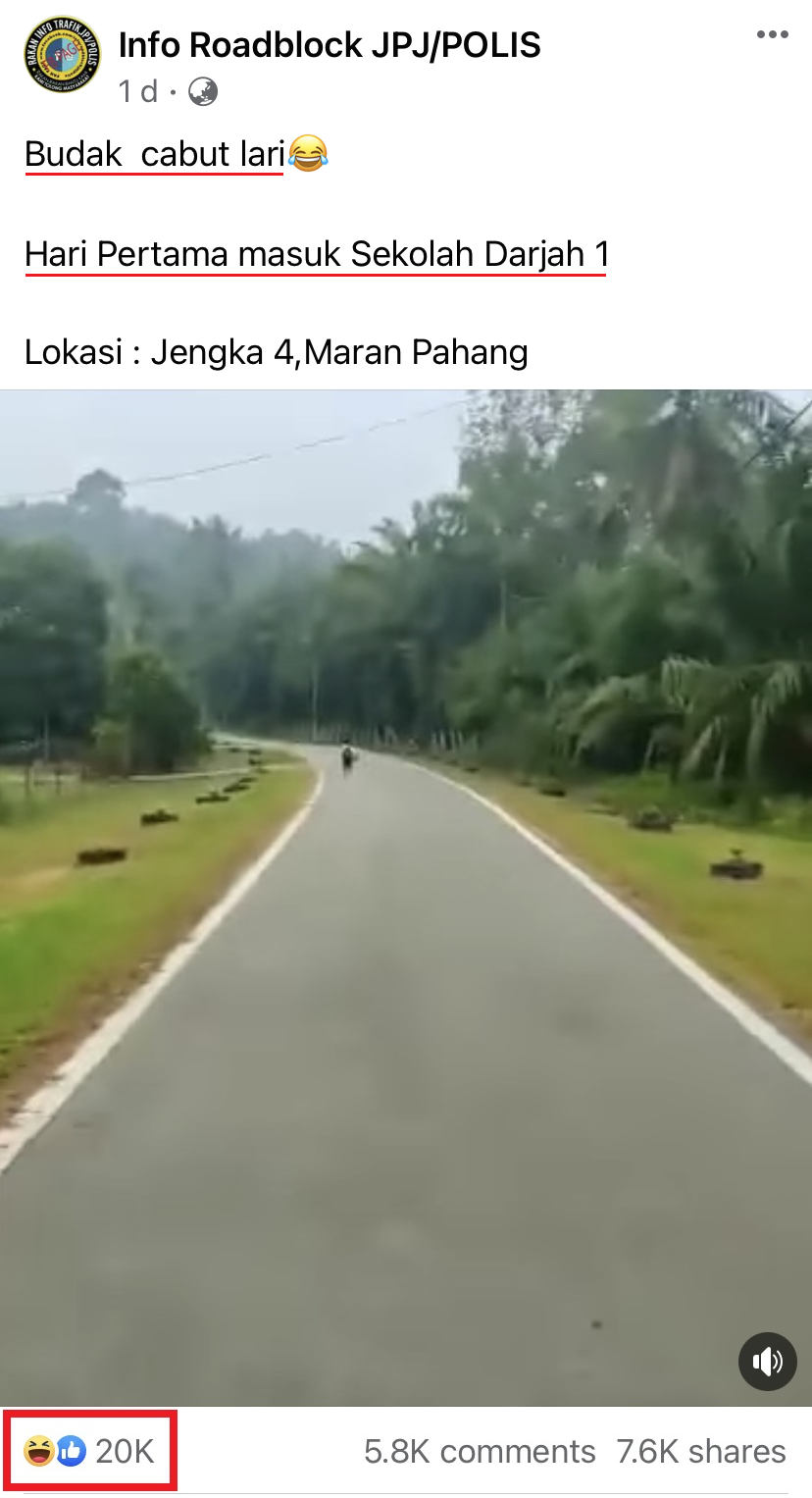 大马脸书专页“Info Roadblock JPJ/POLIS”在昨天上传一段视频笑翻网民,短短1天就累计多达20,000人点赞和7,600次分享!