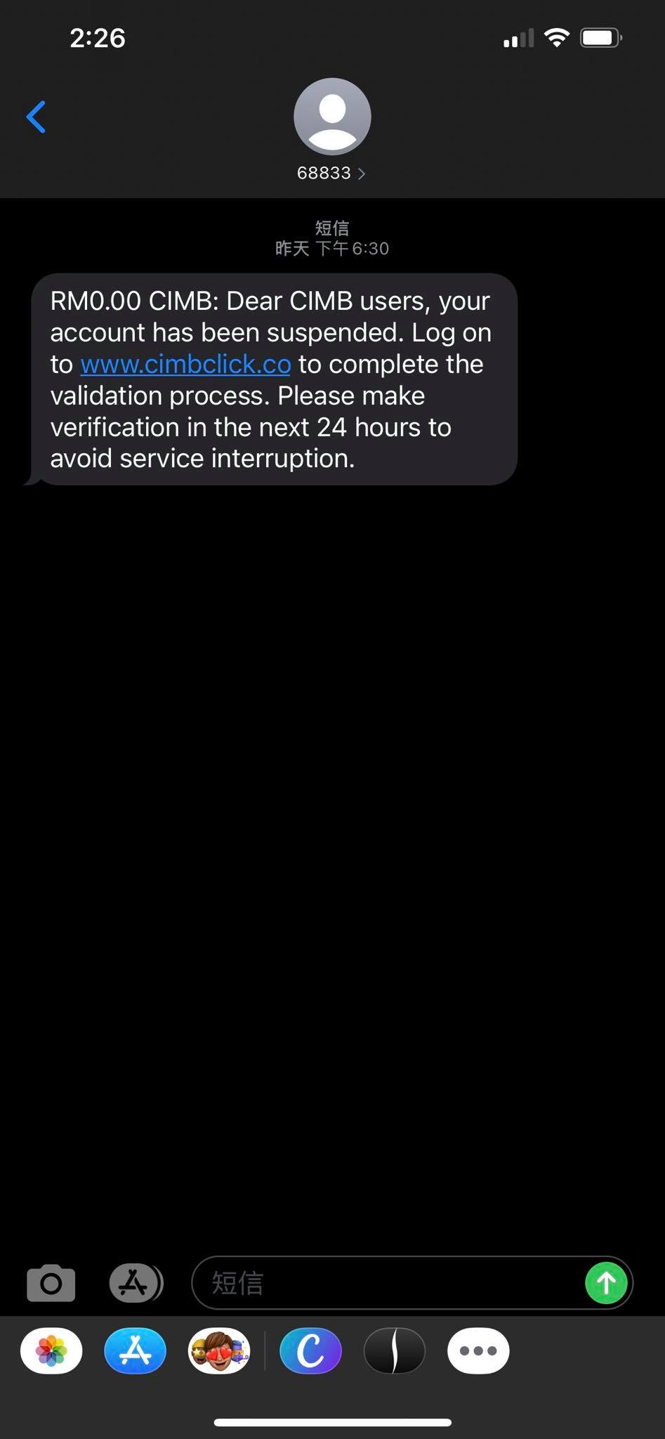 一名大马网友在面子书上分享:星期日的傍晚收到一封来自CIMB Bank 的简讯!该简讯显示出自己的户口被暂停(Suspended)了!并要在24小时内点击该链接来验证CIMB 户口!