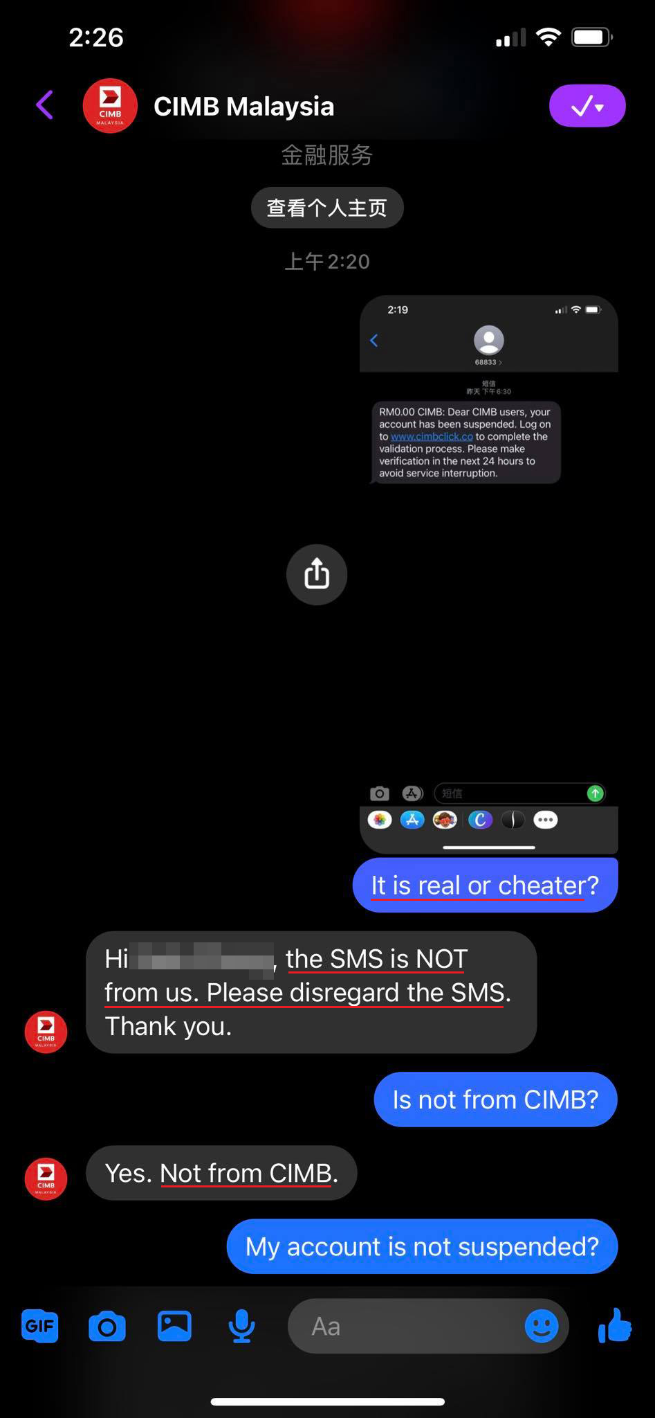 ▼ 此外,网友还截图该信息的内容询问CIMB 客服!并回应此信息不是由CIMB 所发出来!
