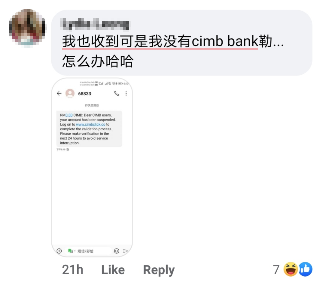 ▼ 而且还表示没有CIMB 户口,却收到此信息!一定是骗人的!
