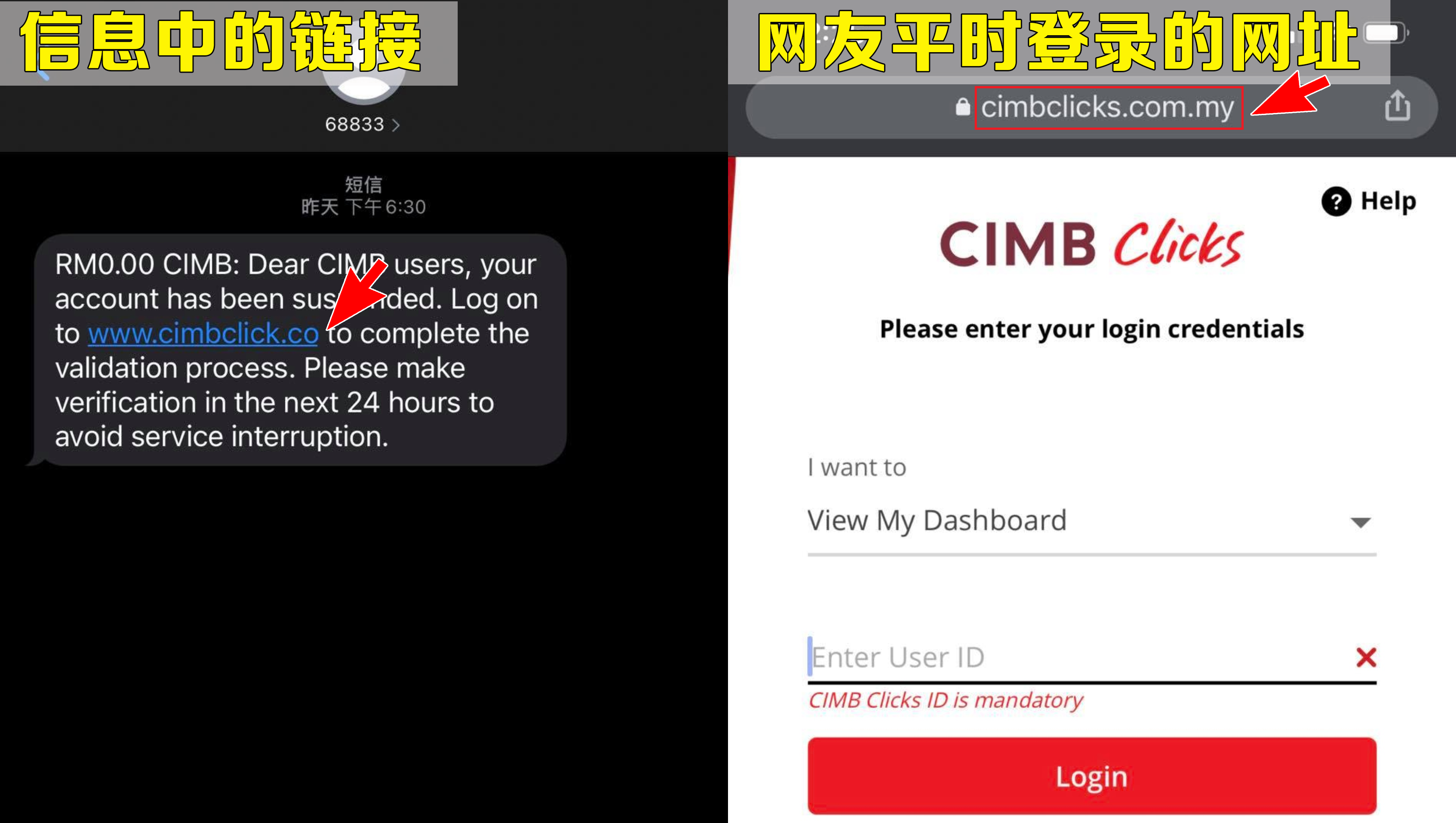▼ 经过网友查询之后,发现简讯里的网址和CIMB Clicks 官网的链接是不相同的!