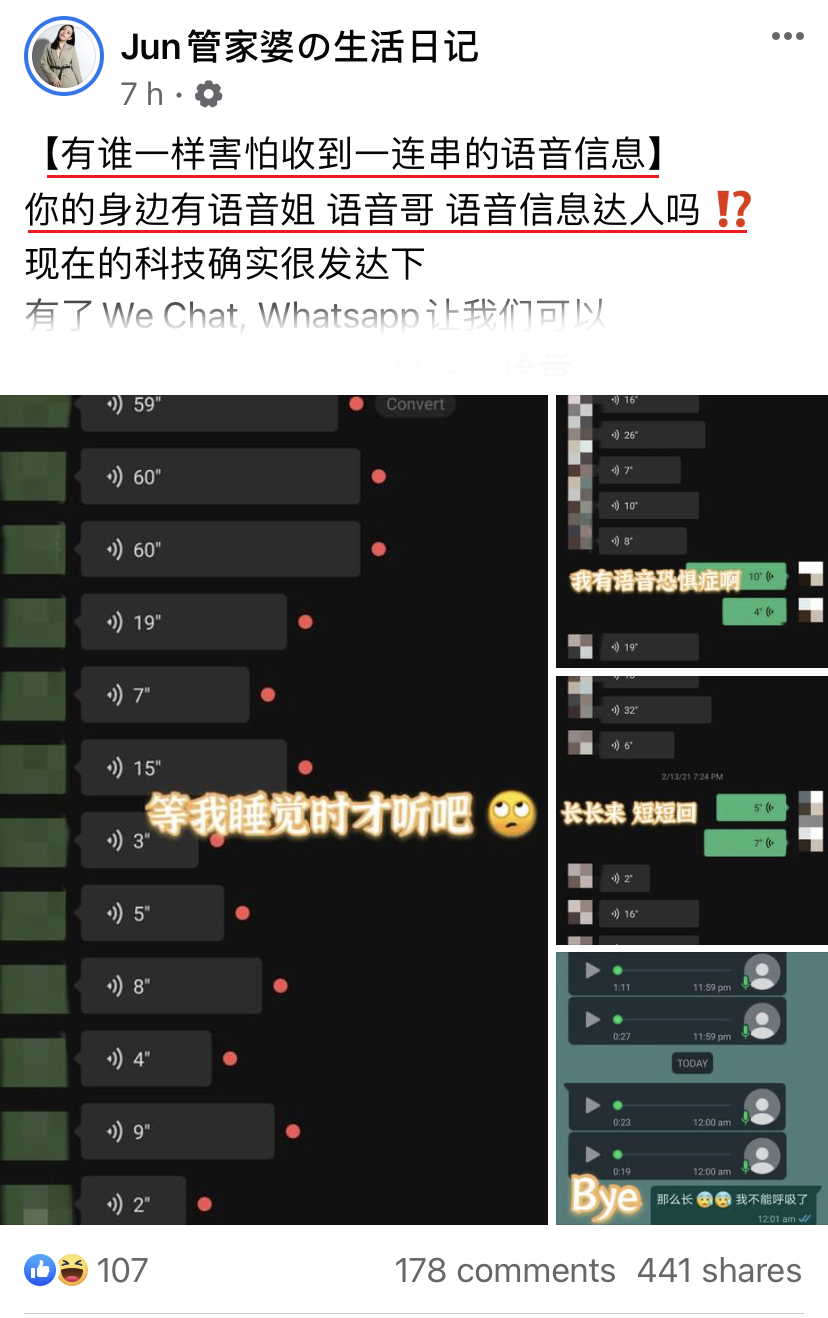 你的身边有语音姐、语音哥、语音信息达人吗?!现在的科技确实很发达下,有了WeChat和WhatsApp让我们可以快速方便,通过打电话到打字、语音、video call 来沟通。